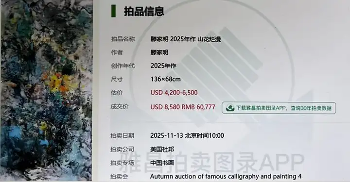 2025年11月13日,美国杜邦拍卖会的中国书画专场现场,随着拍卖师落槌的清脆声响,滕家明先生的《山花烂漫》以8580美元(含佣金,折合人民币60777元)的价格成交,这幅创作于2025年的画作,在国际艺术舞台上完成了一次精彩的亮相,也让中国当代写意绘画的魅力再度为海外藏家所感知。